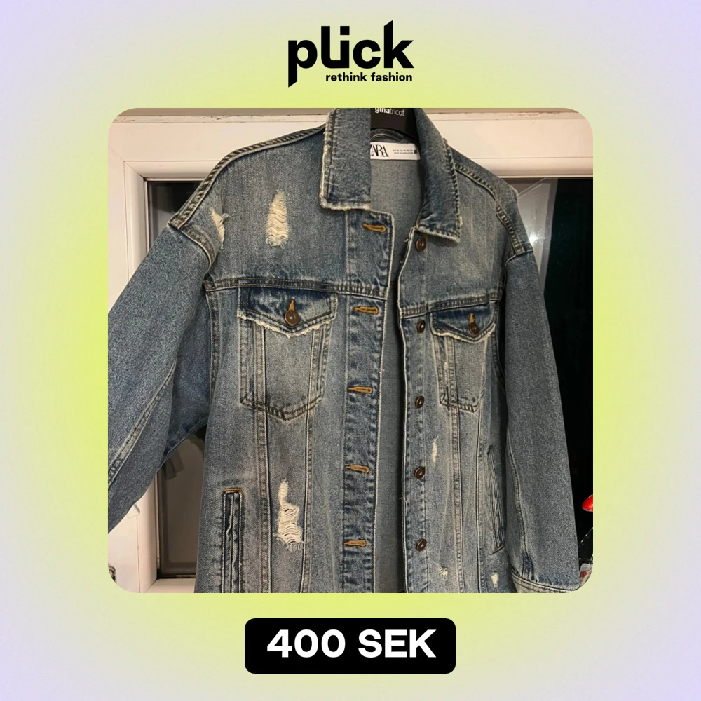 Säljer en jeansjacka från Zara som är knappast använd. Den har en klassisk blå denimfärg med slitna detaljer som ger en vintagekänsla. Den är i storlek XS men är oversized.