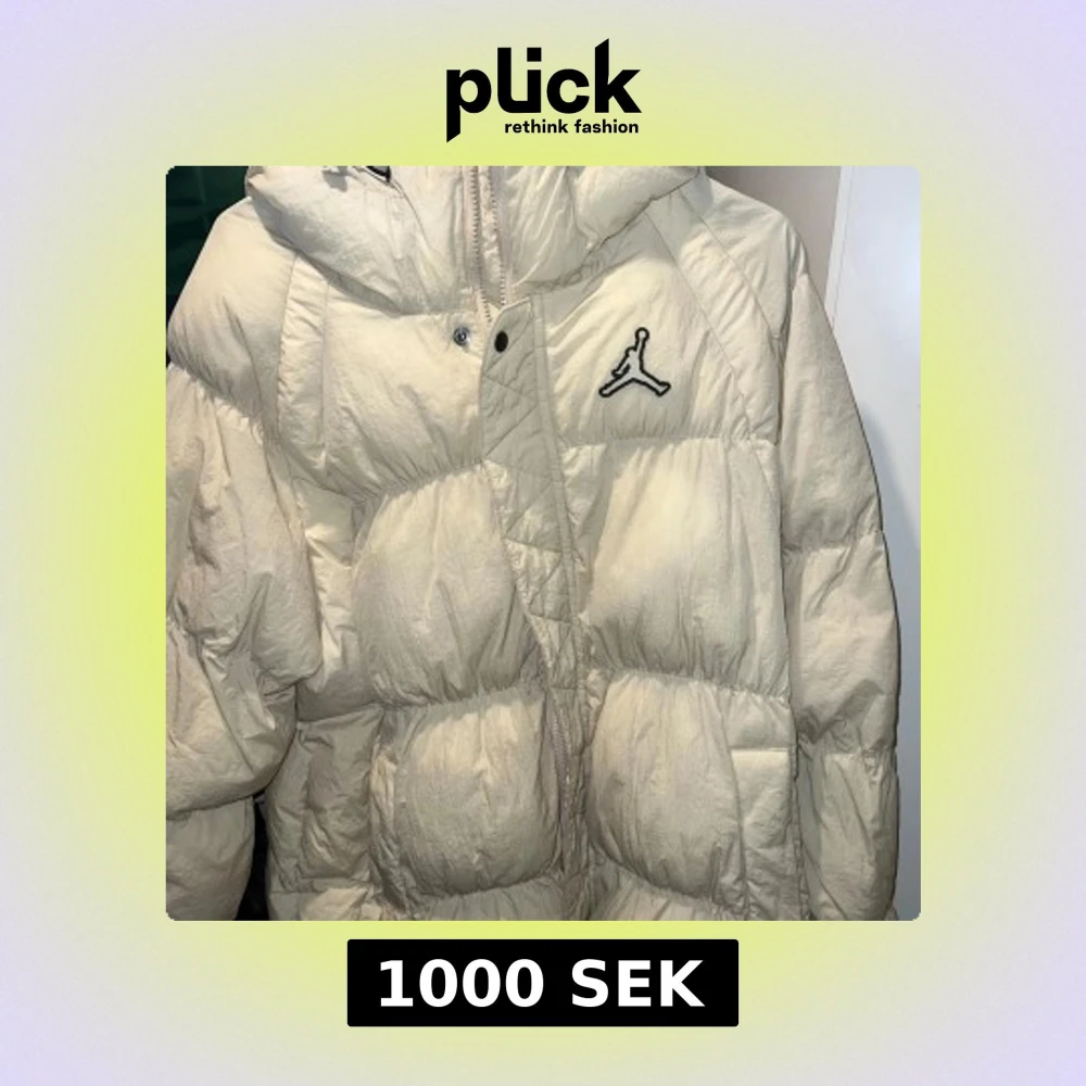 Säljer en snygg vit dunjacka från Jordan med huva och dragkedja. Jackan har ett broderat märke på bröstet och är perfekt för kyliga dagar. Storlek M men passar även som S