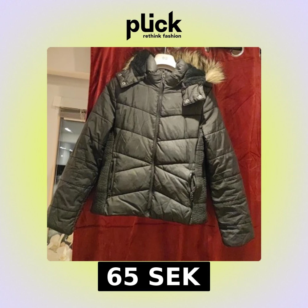 Snygg svart quiltad vinterjacka med avtagbar huva och fuskpälsdetaljer. Jackan har dragkedja framtill och praktiska fickor med dragkedjor. Perfekt för kalla dagar. Obs trasig på på ett ställe arm bak. Annars är den i bra skick.