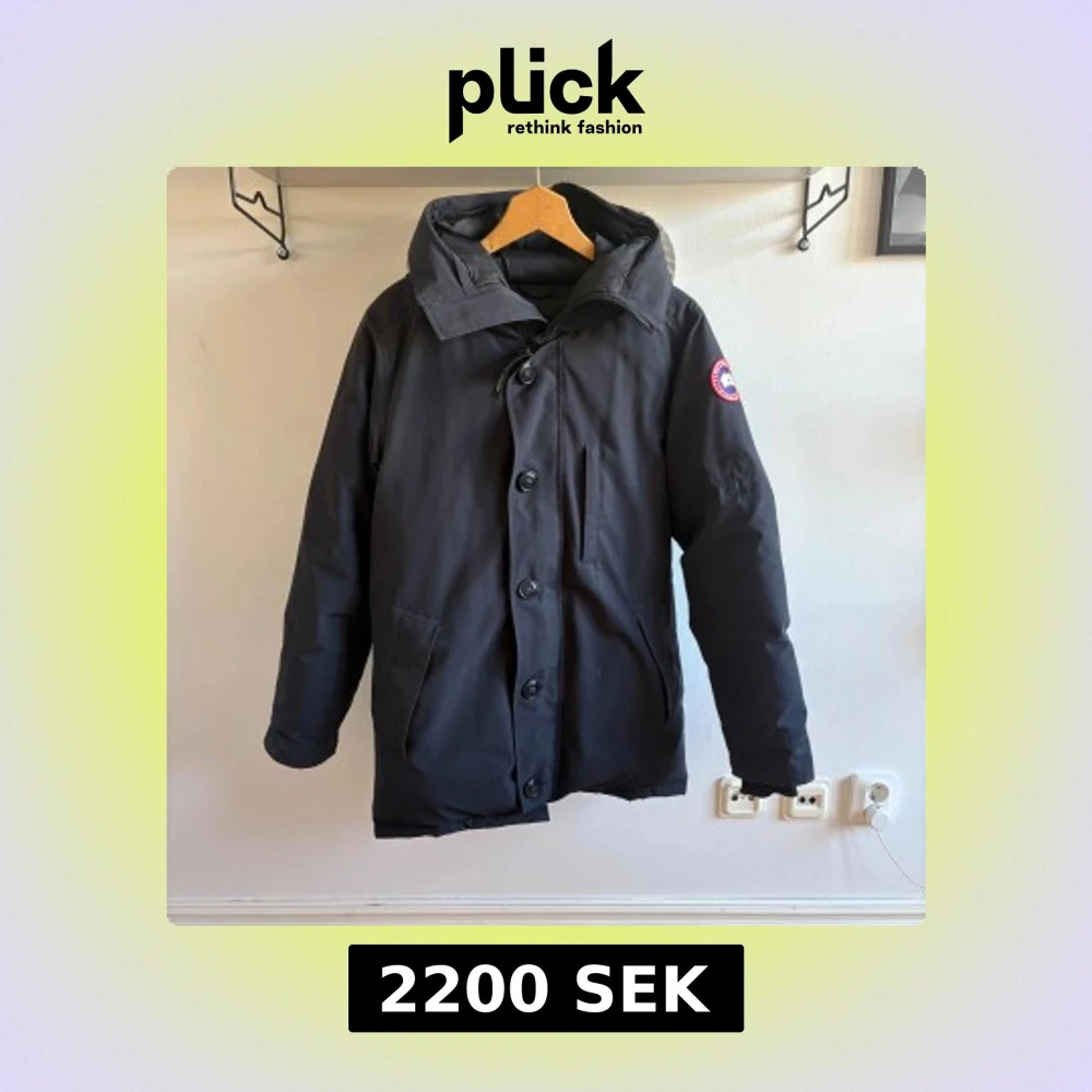 Säljer en svart dunjacka från Canada Goose med huva och klassisk logga på . flera fickor och en varm, quiltad insida. den har en lagning på vänster axel som är omärkbar. över de så har inte jackan några skador elle täcken på använding