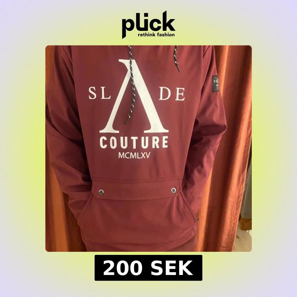Säljer en snygg vinröd hoodie från Slade Couture med tryck framtill. Hoodien har en stor ficka och justerbar huva med snören. Modell 185 cm
