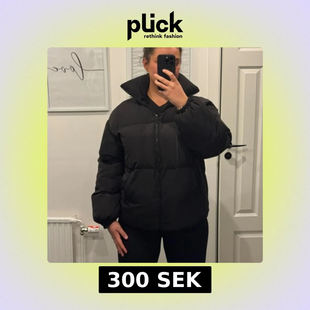 Säljer en svart pufferjacka med hög krage och dragkedja framtill. Jackan har en loose passform och är tillverkad i syntetmaterial. Perfekt för kalla dagar och har en stilren look som funkar till många outfits.