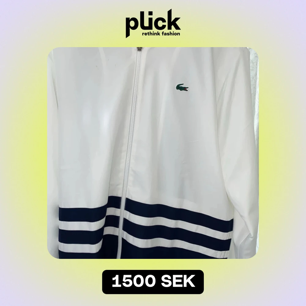 Säljer en snygg vit och marinblå jacka från Lacoste. Jackan har dragkedja och ett coolt randigt mönster längst ner. Den har långa ärmar och det klassiska Lacoste-loggan på bröstet. Perfekt för vår och höst!
