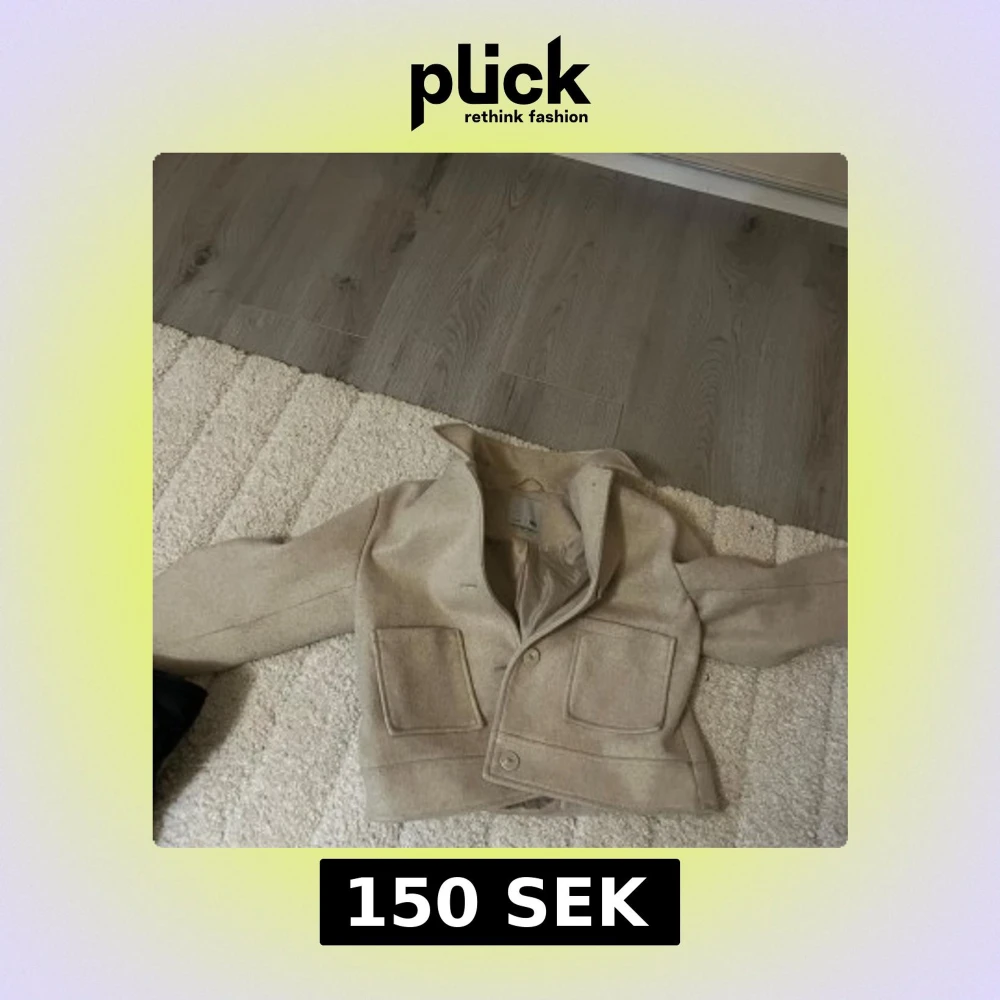 Säljer en beige jacka i ull med klassisk krage och två stora fickor framtill. Jackan har knäppning med två knappar och en croppad passform som ger en trendig look. Perfekt för dig som gillar stilrena och enkla plagg.