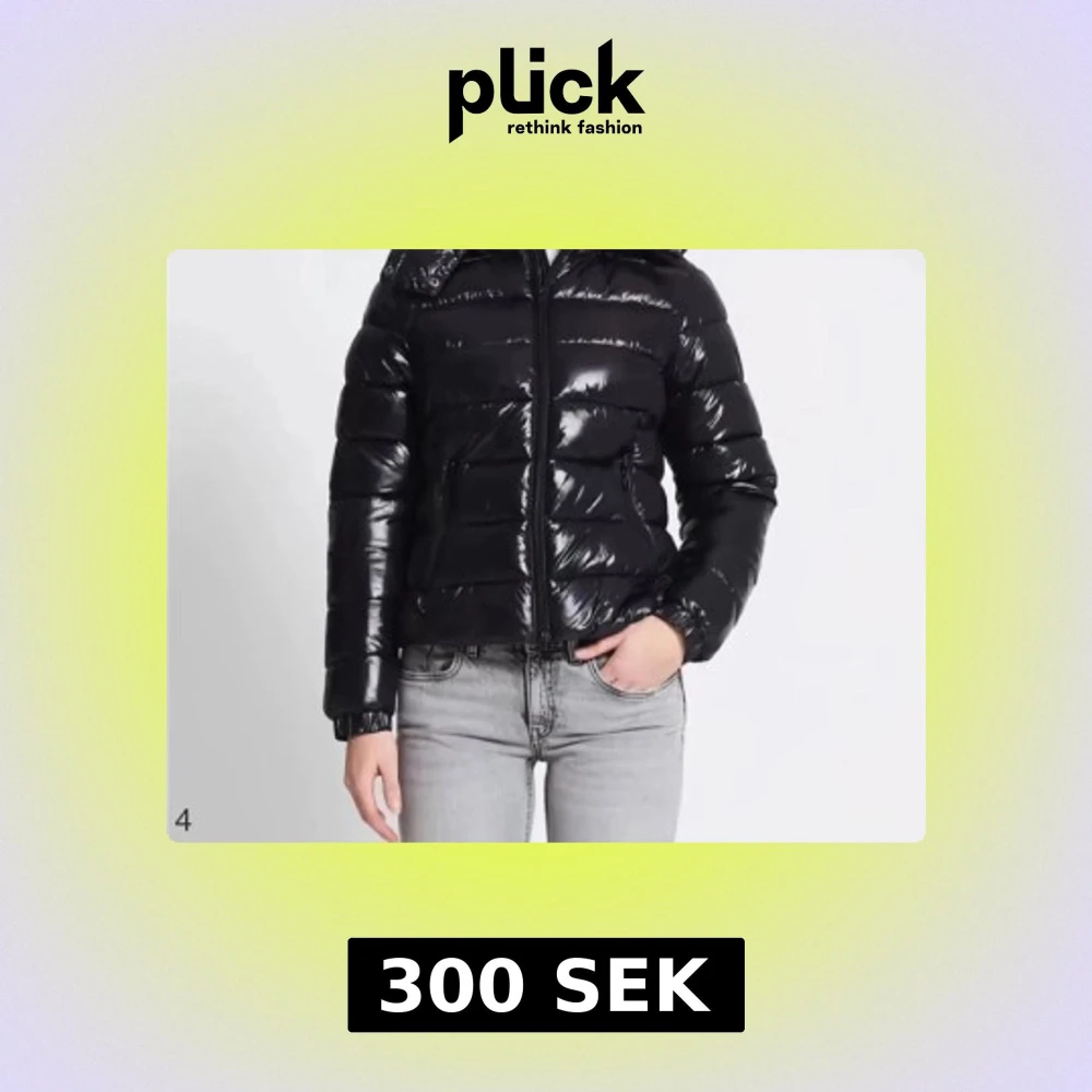 Säljer en svart, glansig pufferjacka med huva och dragkedja framtill. Jackan har en quiltad look med breda kanaler och långärmade armar. Perfekt för kalla dagar när du vill ha en stilren och chill vibe. Passar dig som gillar en klassisk streetstil.