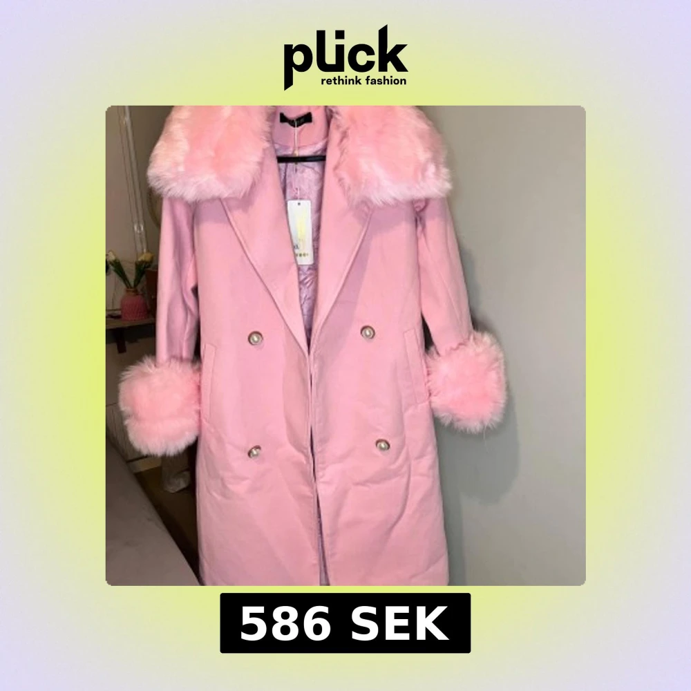 Supersöt rosa kappa med fluffig fuskpäls på krage och ärmslut. Dubbelknäppt med stora pärlknappar och quiltat foder på insidan. Perfekt statement-plagg för dig som vill sticka ut med en gullig och trendig look.