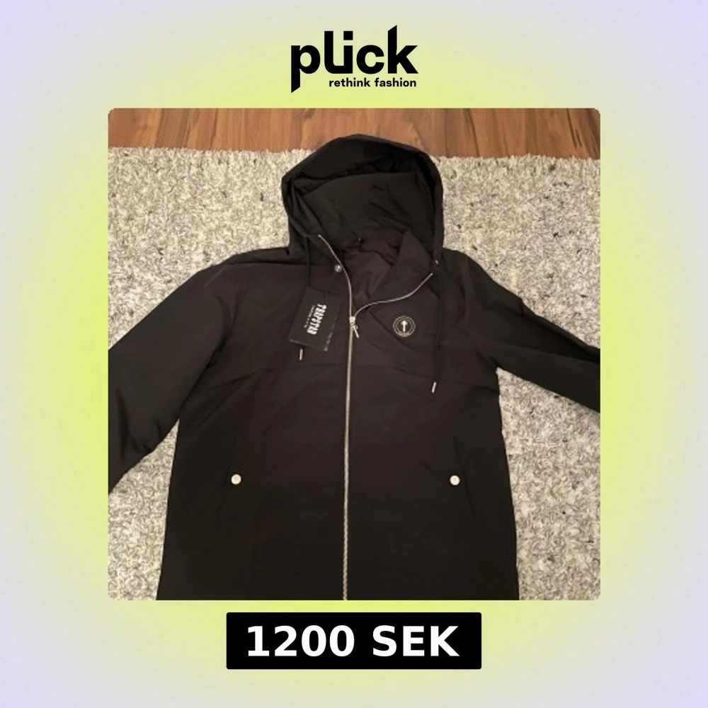 Säljer en svart jacka från Trapstar med huva och dragkedja. Jackan har en cool logga på ryggen och praktiska fickor med knappar framtill. Perfekt för en stilren look.