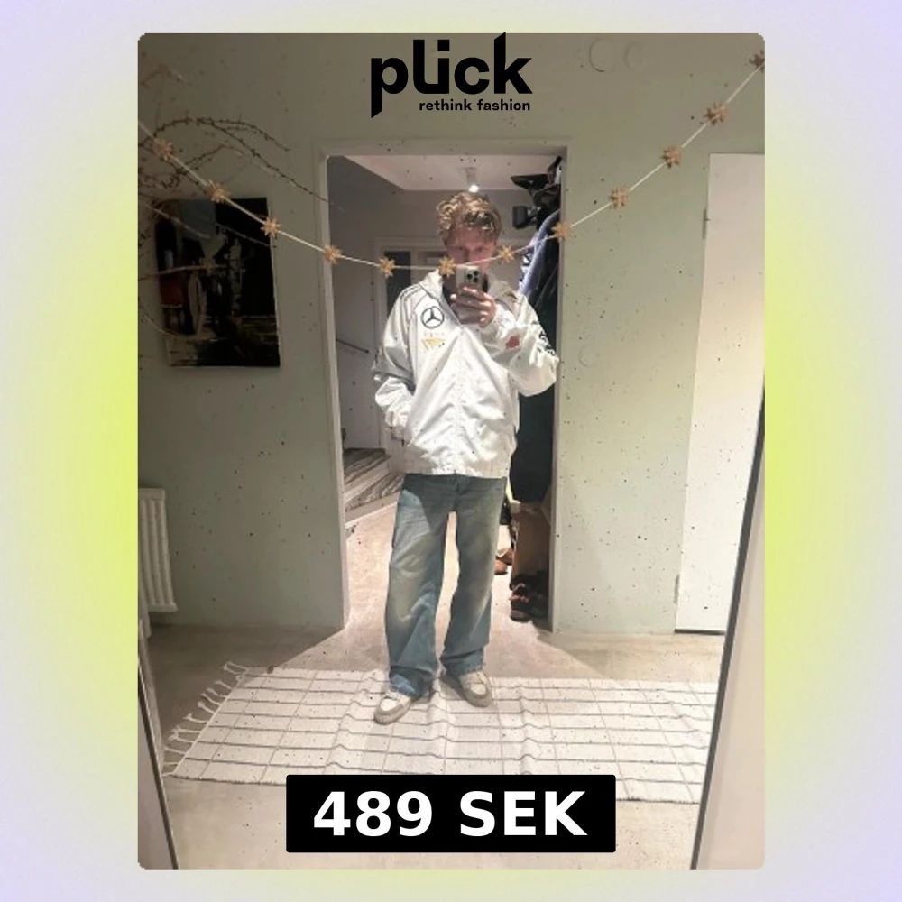 Säljer en vit vindjacka med huva från GOALSTUDIO x T1, med feta Mercedes, Red Bull och Samsung Odyssey-loggor samt ZEUS-tryck på ryggen. Jackan har dragkedja, svarta detaljer på sidorna och röda sömmar. Insidan har coolt mönstrat foder.