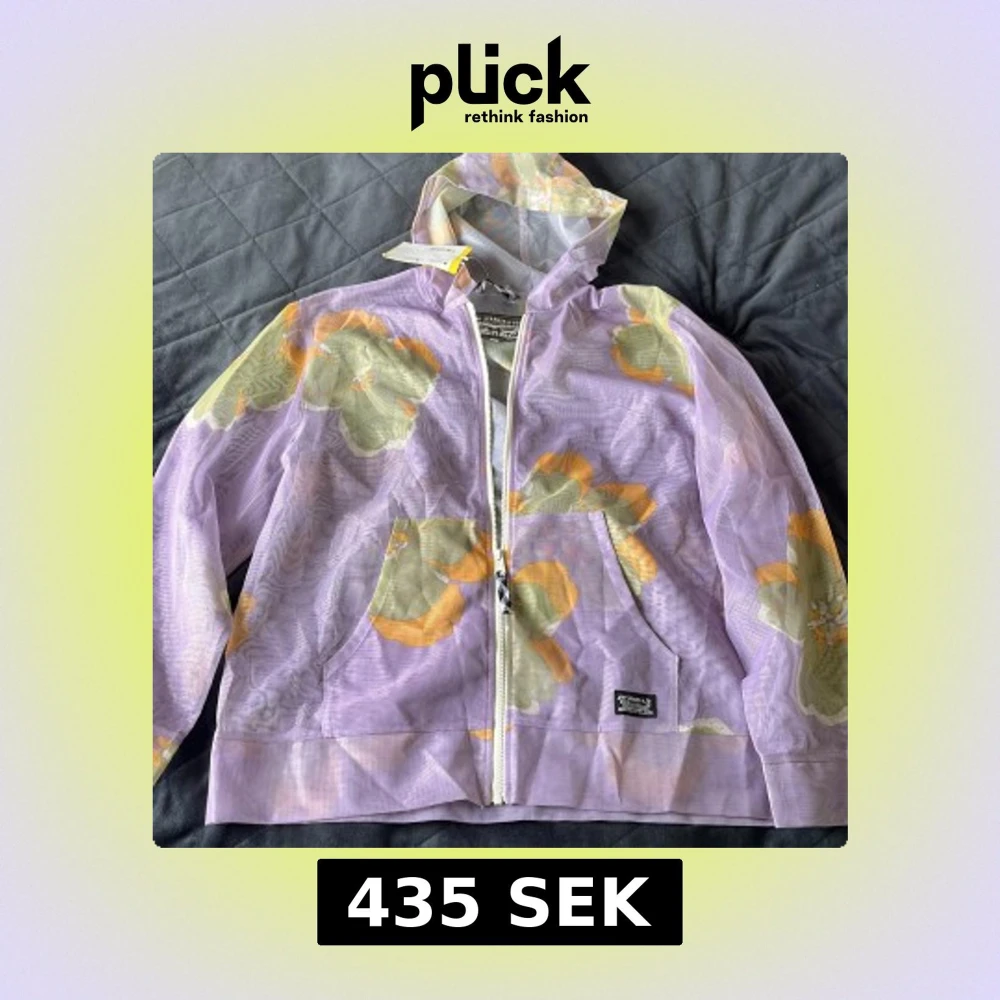 Säljer en tunn och luftig vindjacka från Levi's i lila med stora blommor i grönt och orange. Jackan har huva, dragkedja framtill och två stora fickor. Tillverkad i 100% återvunnen polyester, perfekt för dig som vill sticka ut med en färgglad och unik stil.