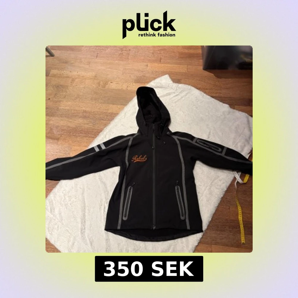 Svart vindjacka från Rebel med grå detaljer och reflexränder. Jackan har huva med dragsko, två dragkedjeförsedda fickor och broderad orange logga på bröstet. Tillverkad i polyester och spandex för smidig passform. Perfekt för blåsiga dagar. Bra skick ovanpå inte så bra inuti. De limmade banden på sömmarna har släppt. Se bild