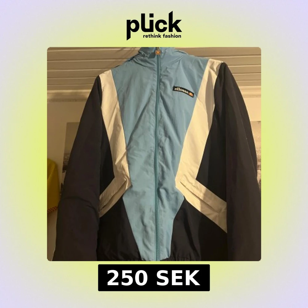 Snygg vindjacka från Ellesse i ljusblått och vitt med mörkblå detaljer. Jackan har en dragkedja framtill och en praktisk huva. Perfekt för blåsiga dagar! Den är som ny knappast använd.