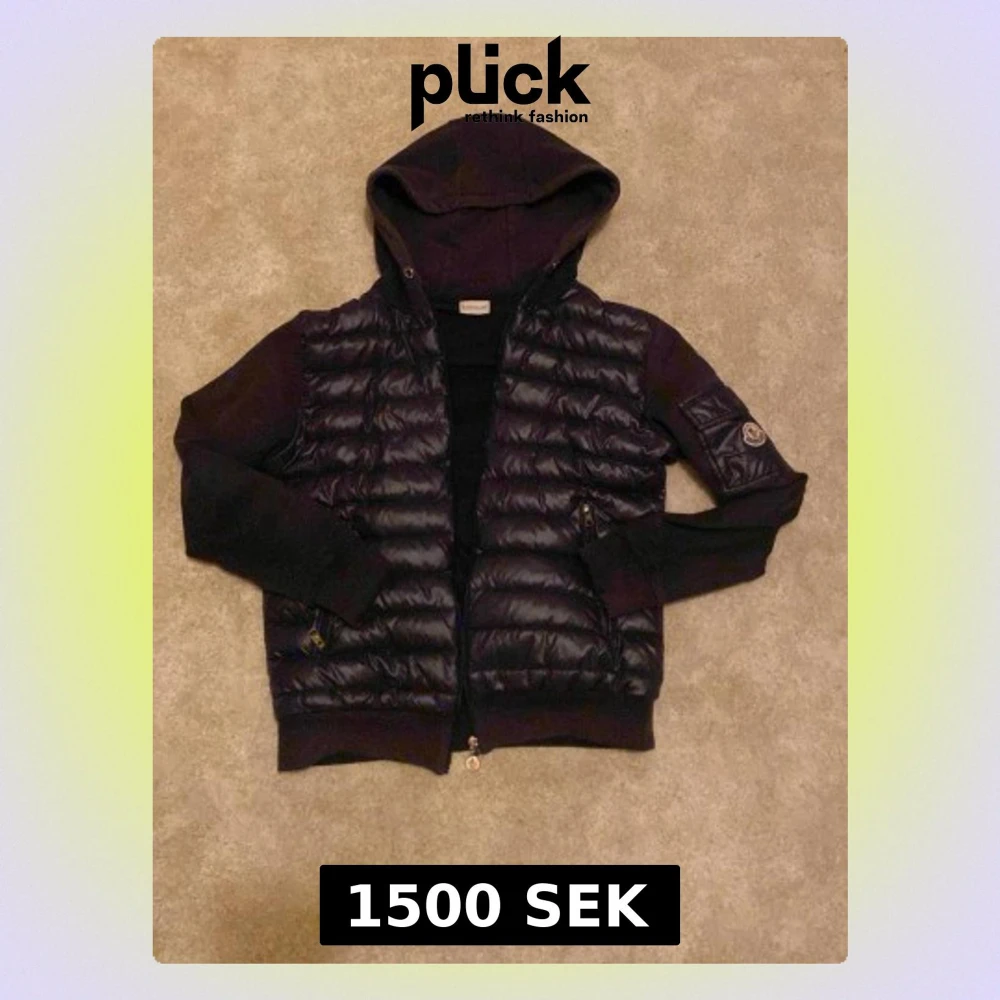 Säljer en svart pufferjacka från Moncler i storlek M. Jackan har quiltad front i blankt material, mjuka stickade ärmar och huva. Dragkedja framtill och fickor med dragkedja. Klassisk Moncler-logga på ärmen och snygg urban look. Den är lätt solblekt, och har ett hål i högra fickan men man ser inte hålet ifrån utsidan.