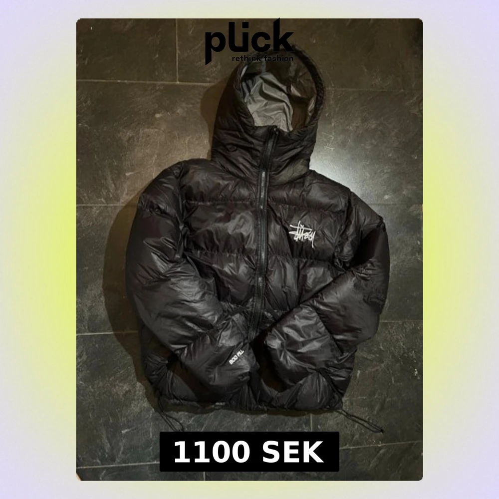 Säljer en svart pufferjacka från Stüssy med huva och dragkedja framtill. Jackan har Stüssy-logga broderad på bröstet och justerbara snören nedtill. Perfekt för kalla dagar och riktigt snygg streetwear-vibe.