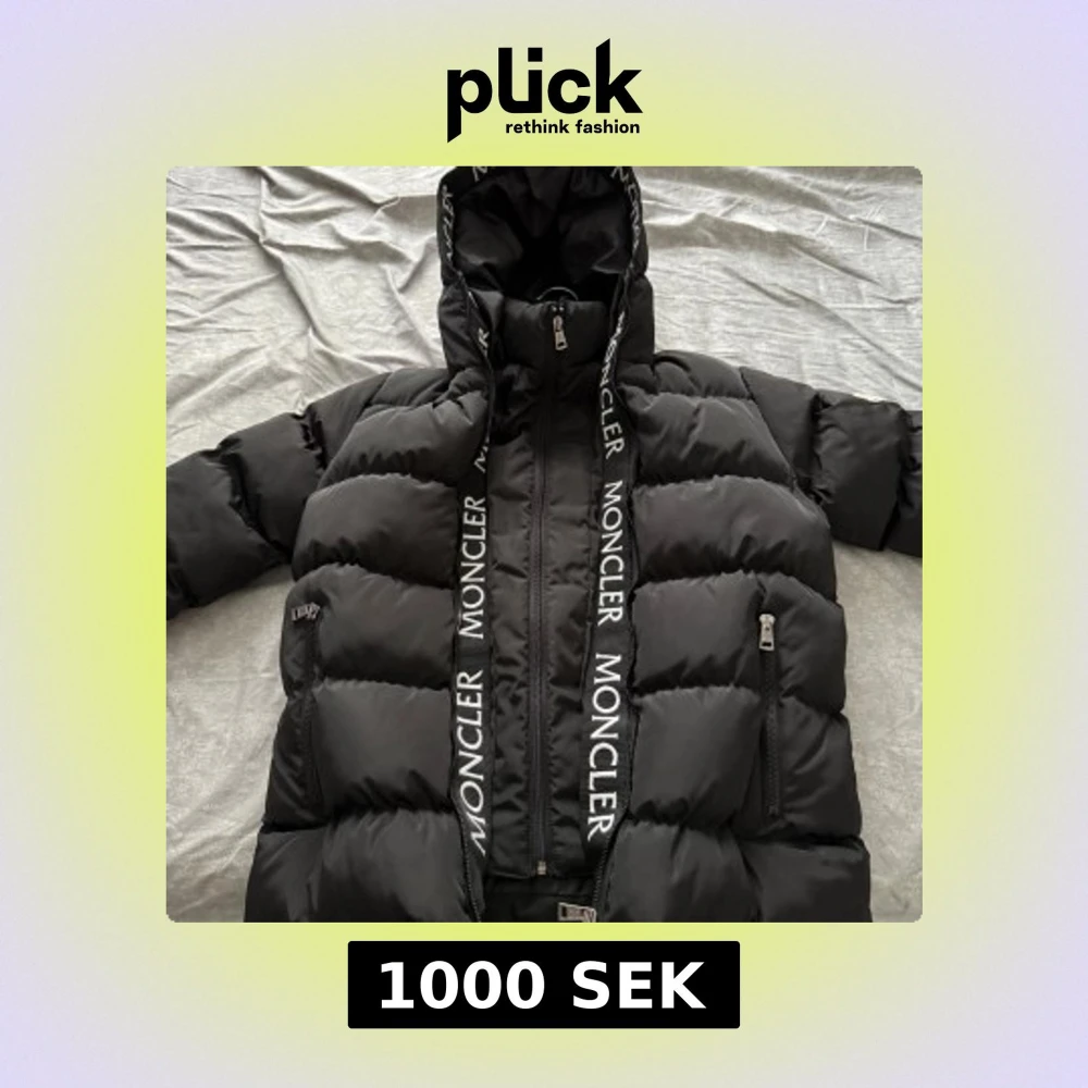 Säljer en svart dunjacka från Moncler med stor huva och tydliga logotexter längs dragkedjan. Jackan har två fickor med dragkedja och klassisk Moncler-logga på ärmen. Perfekt för kalla dagar och riktigt snygg streetstil.