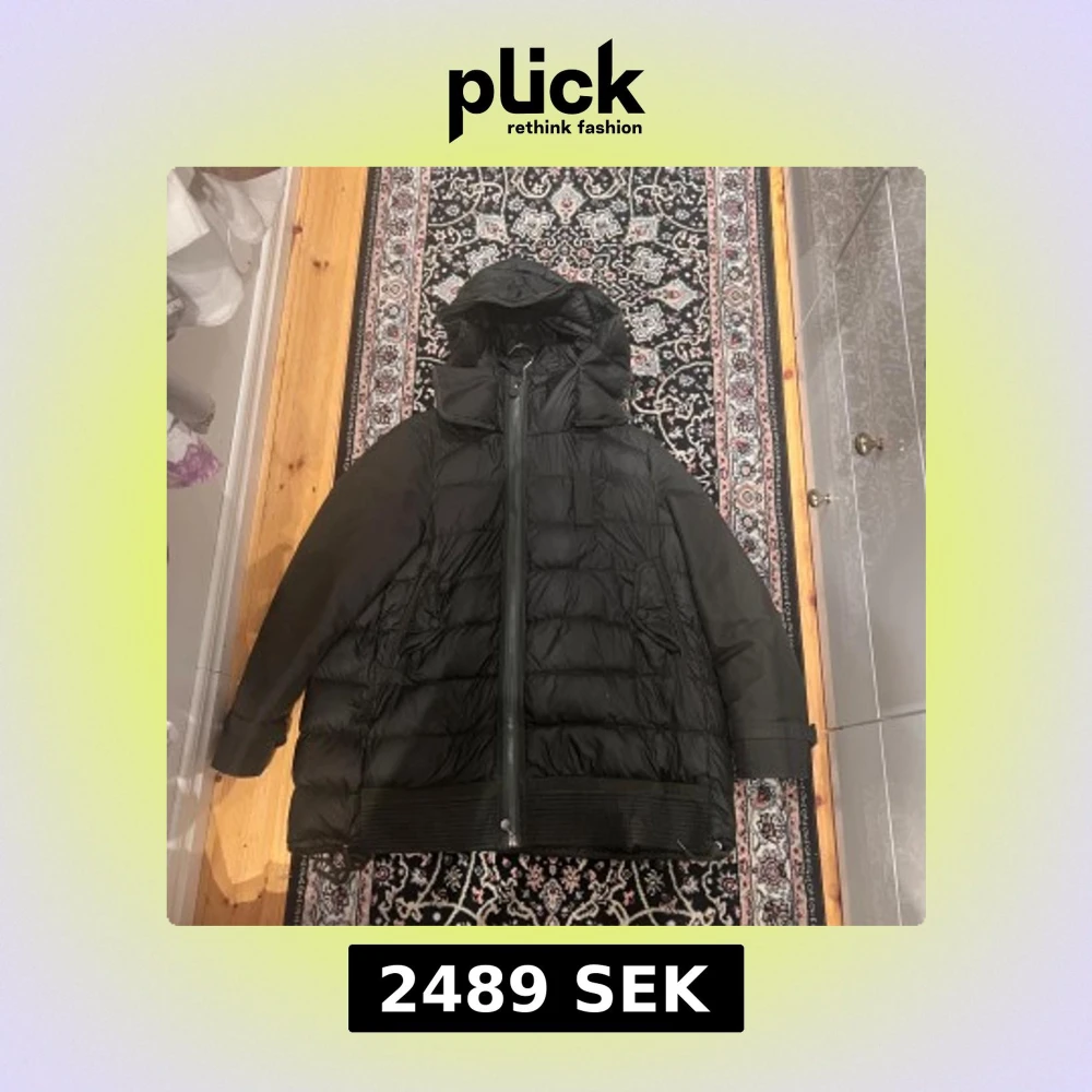 Säljer en svart dunjacka från Moncler med huva och quiltad design. Jackan har dragkedja framtill, knappar och praktiska fickor. Materialet är polyester med dunfyllning, perfekt för kalla dagar. Snygg och stilren look som funkar till många outfits. Mycket bra skick endast små hål och en saknad knapp