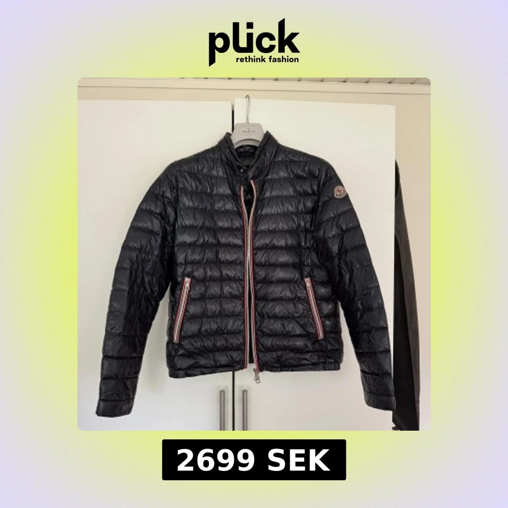 Snygg svart dunjacka från Moncler med klassiska röda och vita detaljer på dragkedjorna. Jackan har hög krage, två fickor med dragkedja och Moncler-logga på ärmen. Perfekt för höst/vår. Storlek 2. Fint skick. Pris kan absolut diskuteras.