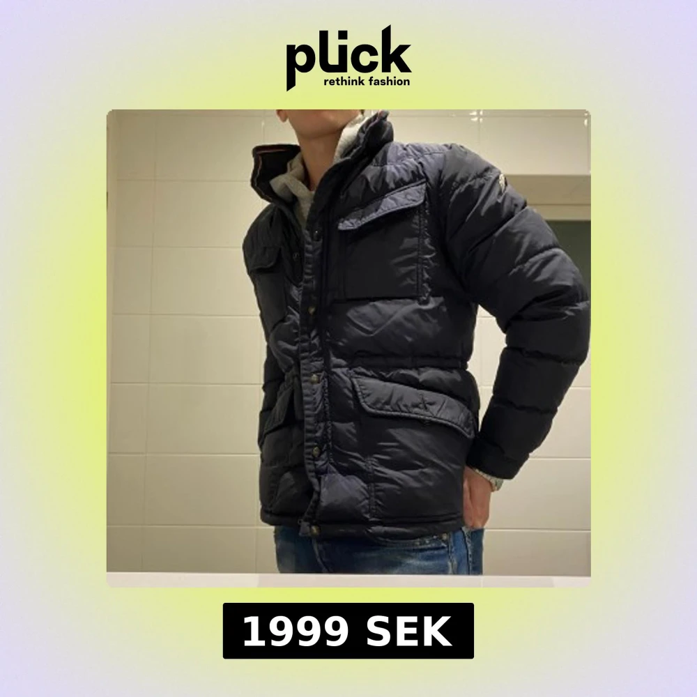 Snygg mörkblå dunjacka från Moncler med hög krage, flera fickor med lock och dragkedja samt tryckknappar framtill. Jackan har Moncler-logga på ärmen och är tillverkad i glansig polyester.✅ Perfekt för kalla dagar. Skriv privat för fler bilder eller med bild på✅