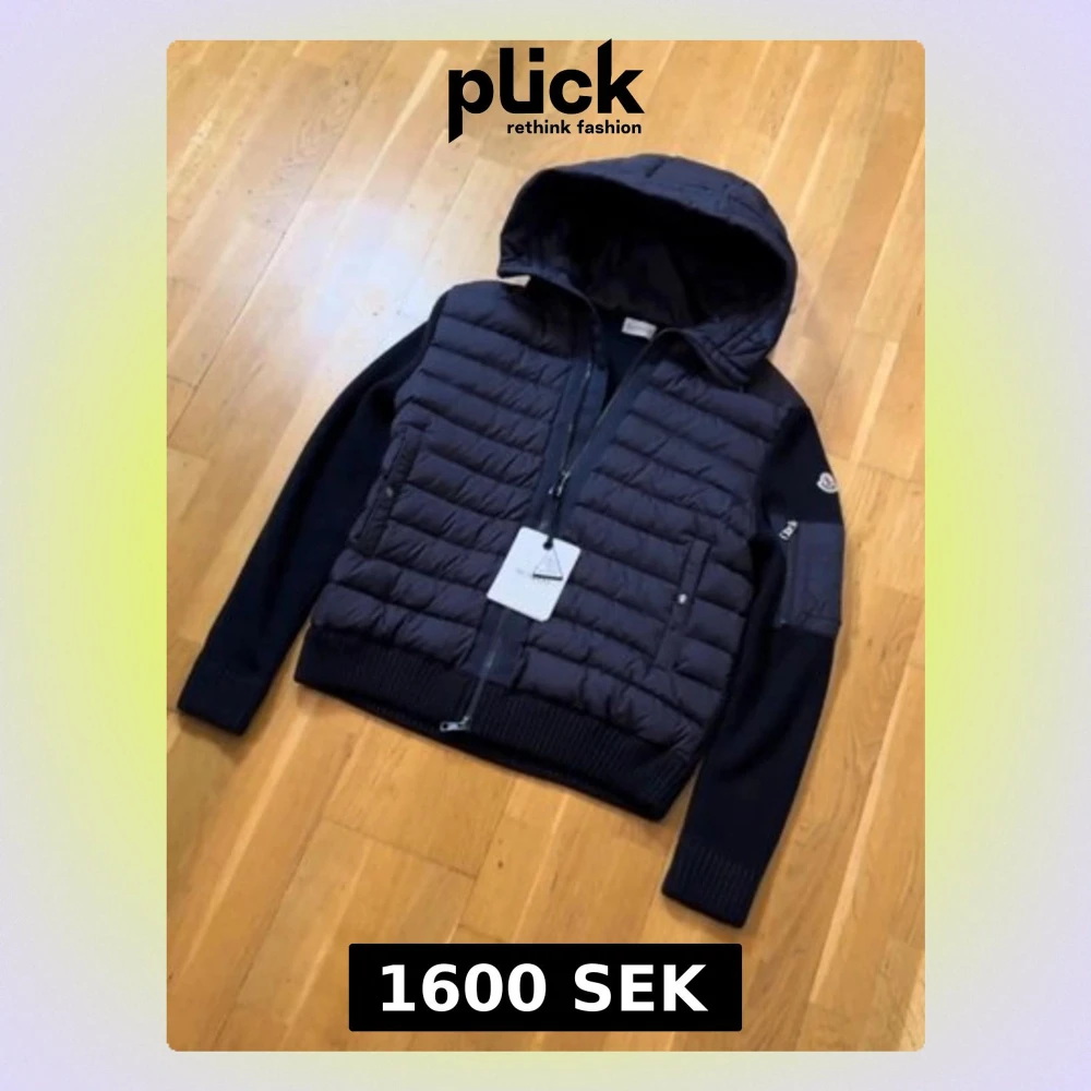 Säljer en mörkblå pufferjacka från Moncler med huva och ribbade muddar. Jackan har quiltad front, dragkedja, fickor med tryckknappar och en liten ficka på ärmen. Ärmarna är stickade för extra komfort och jackan har en clean, sportig look.
