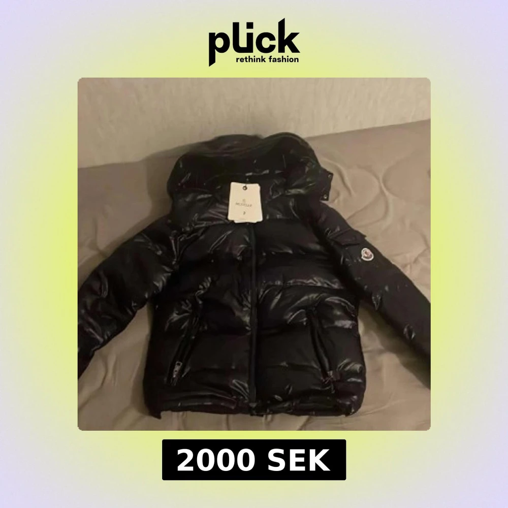 Säljer en snygg svart dunjacka från Moncler. Jackan har en glansig finish och är utrustad med en dragkedja och huva. Perfekt för kyliga dagar med sin varma och stilrena design. NFC funkar också