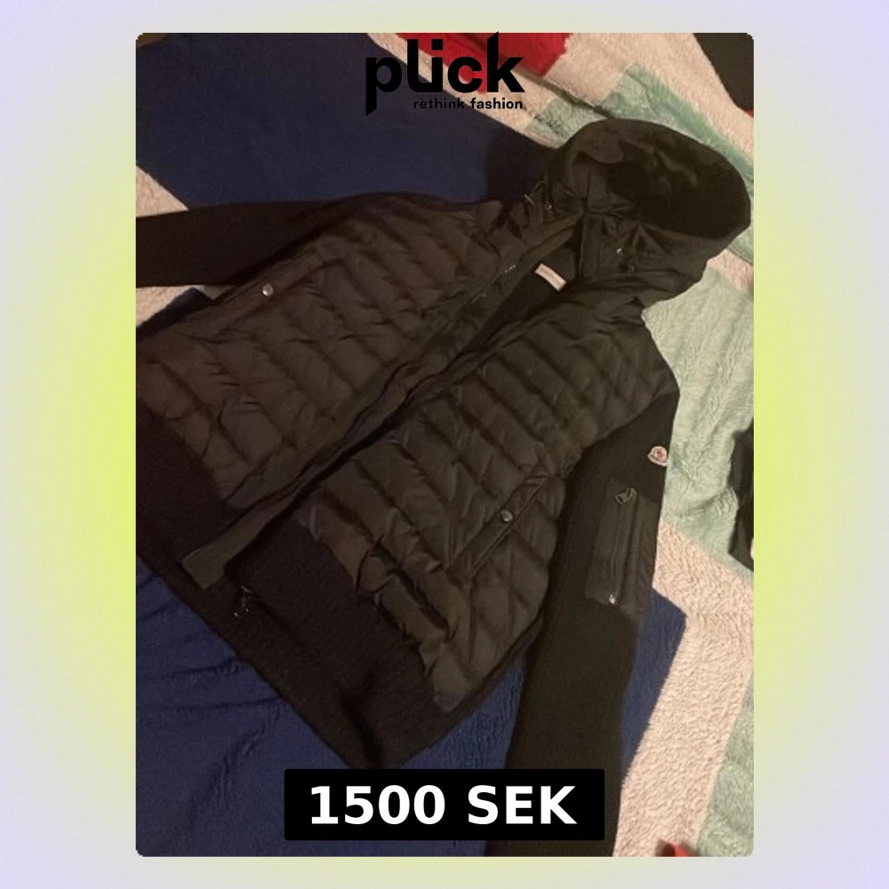 Snygg svart dunjacka från Moncler med quiltad front och stickade ärmar. Jackan har huva, dragkedja framtill och en praktisk ficka med dragkedja på ärmen. Perfekt för kyliga dagar och riktigt stilren look.