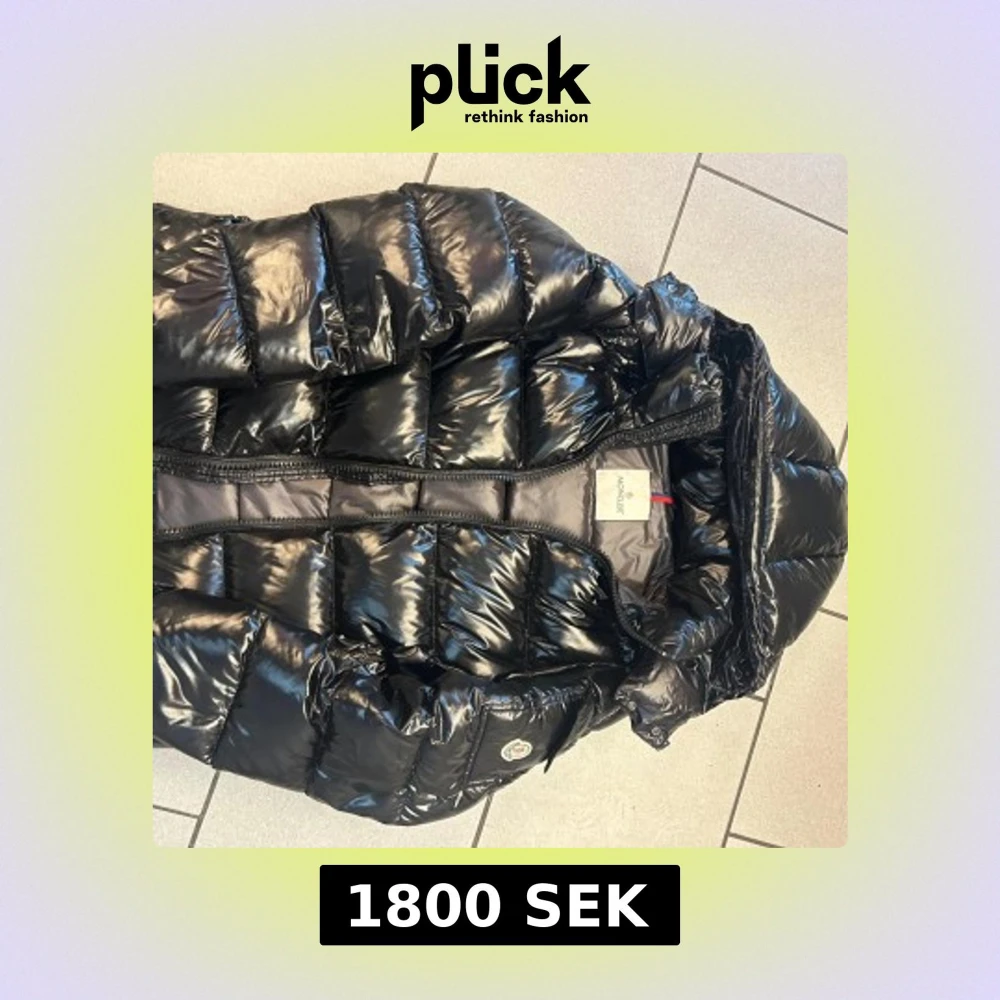 Säljer en svart, glansig dunjacka från Moncler med klassisk puffer-design. Jackan har huva, dragkedja framtill och en ficka med Moncler-logga på ärmen. Perfekt för kalla dagar och riktigt snygg streetstil. Nfc funkar!
