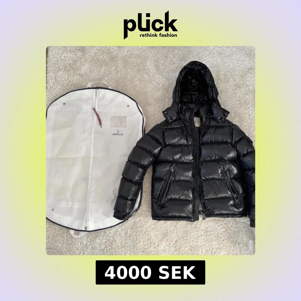 Säljer en svart pufferjacka från Moncler med glansig finish, huva och dragkedja framtill. Jackan har Moncler-logga på ärmen, praktiska fickor med dragkedja och coolt serietryck på insidan. Perfekt för dig som vill ha en snygg och varm vinterjacka.