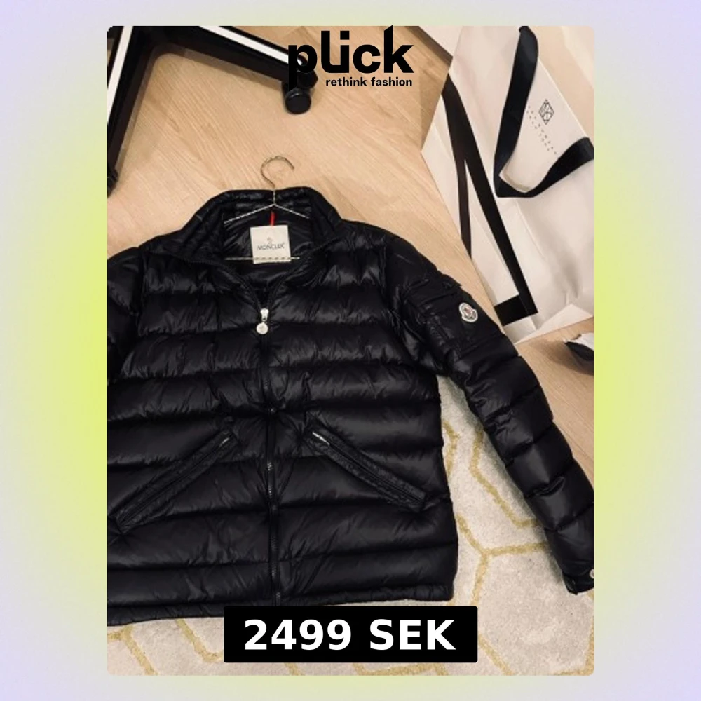 Säljer en svart pufferjacka från Moncler med klassisk quiltad design och två dragkedjeförsedda fickor framtill. Jackan har hög krage, lång ärm och ikonisk Moncler-logga på armen. Materialet är glansig polyester och jackan stängs med dragkedja.