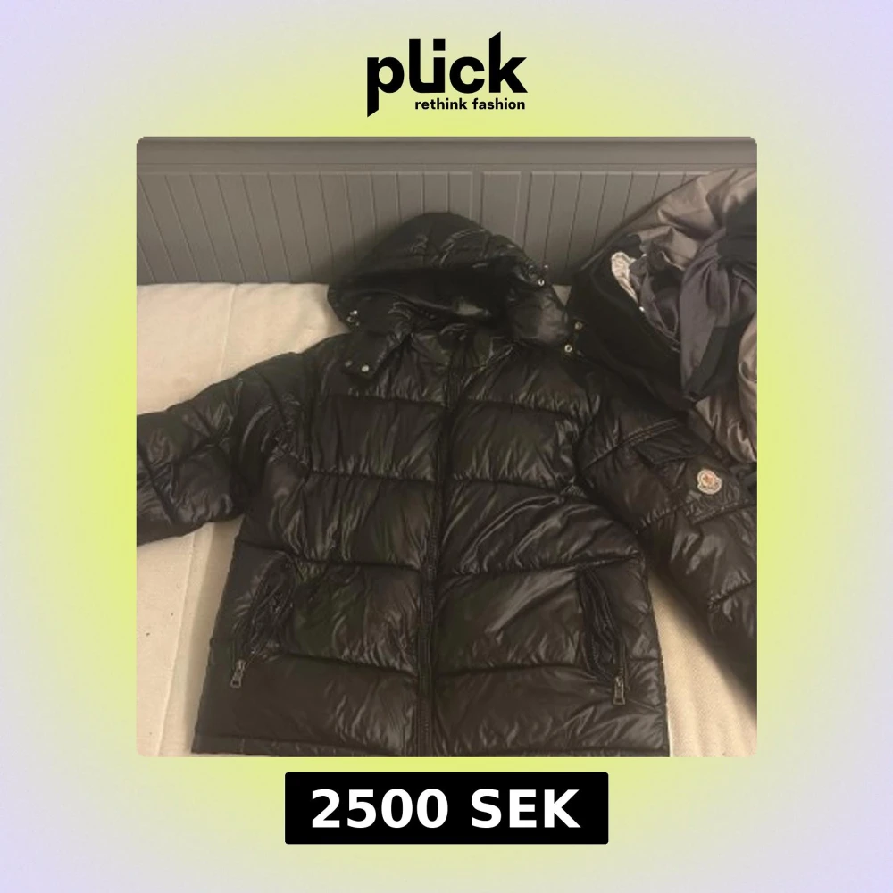 Säljer en svart pufferjacka från Moncler med klassisk logga på ärmen och coolt serietidningsfoder på insidan. Jackan har huva, dragkedja framtill och två fickor med dragkedja. Perfekt för kalla dagar när du vill hålla stilen och värmen.