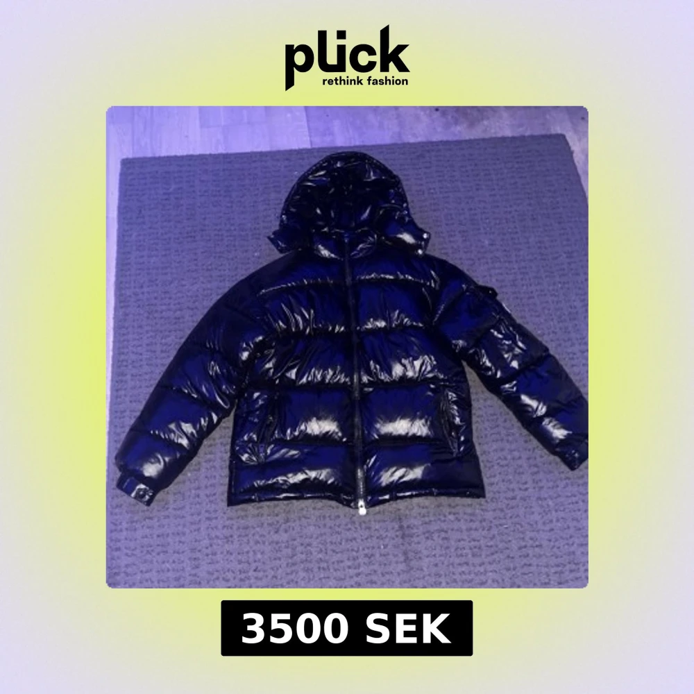 Säljer en svart glansig pufferjacka från Moncler storlek S men passar M. med huva och dragkedja. Jackan har Moncler-logga på ärmen, praktiska fickor med en extra ficka inuti och snygga detaljer som tryckknappar och snörning vid huvan. Perfekt för dig som vill ha en fet vinterjacka med exklusiv vibe