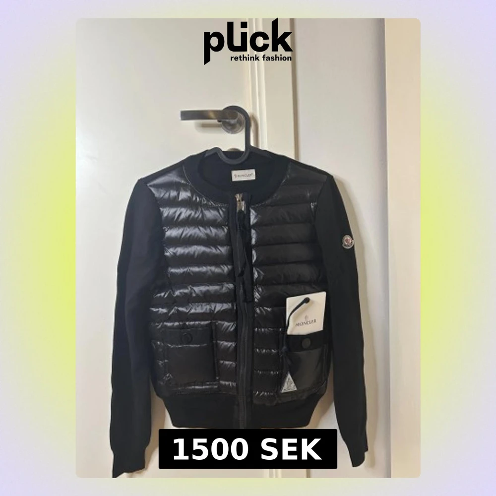 Snygg svart cardigan jacka från Moncler med quiltad framsida och stickade ärmar. Jackan har rund halsringning, dragkedja framtill och två fickor med knappdetaljer. Moncler-logga på ärmen och diskret glansig finish på framsidan ger en exklusiv känsla.