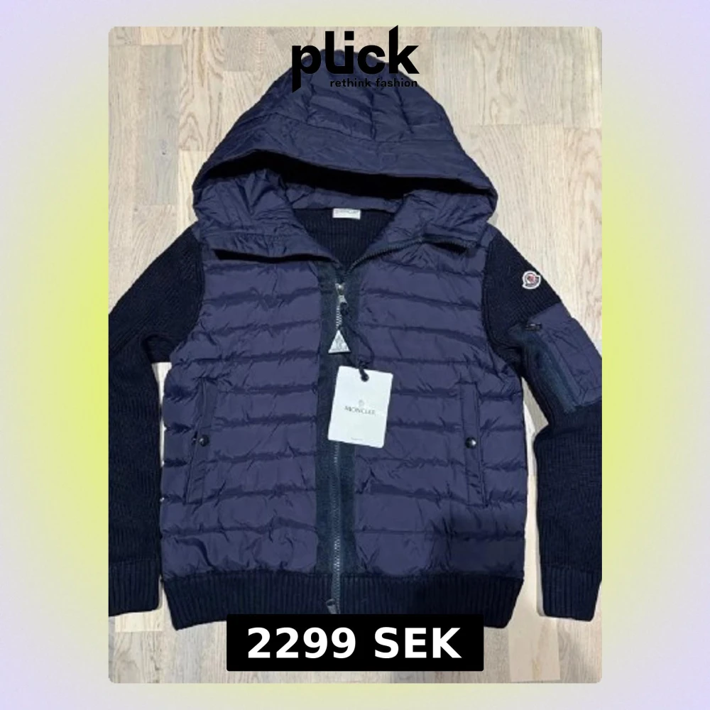 Snygg mörkblå pufferjacka från Moncler med stickade ärmar och huva. Jackan har dragkedja framtill, två fickor med knappar och en extra ficka på ärmen. Perfekt för dig som vill ha en sportig och trendig look.