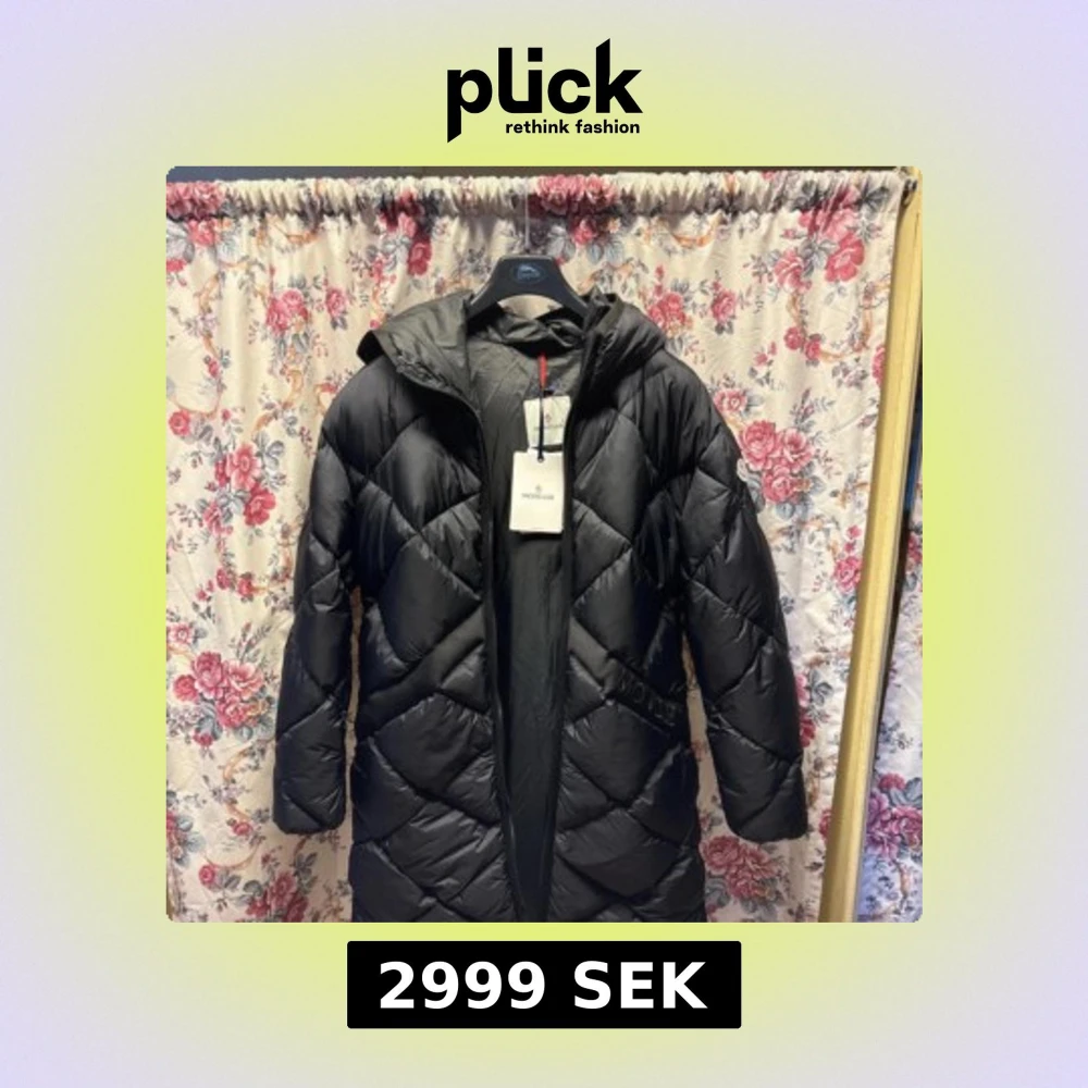 Säljer en svart dunjacka från Moncler med snyggt quiltat mönster och huva. Jackan har lång ärm, dragkedja och Moncler-logga på ärmen. Perfekt för kalla dagar och har en clean, stilren look som funkar till allt. Jackan är tillverkad i polyester och dun.