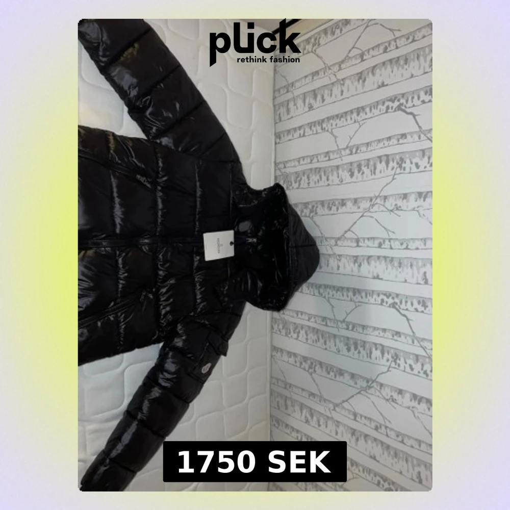 Svart pufferjacka från Moncler med glansig finish, huva och dragkedja framtill. Jackan har quiltad design, långa ärmar och Moncler-logga på ärmen. Perfekt för kalla dagar och har en modern, clean look som funkar till streetwear.