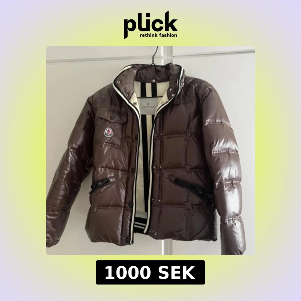 Säljer en brun, glansig dunjacka från Moncler med svartvita detaljer vid kragen. Jackan har dragkedja, två snedställda fickor med dragkedja och en bröstficka med knapp. Klassisk Moncler-logga på bröstet och quiltad design. Den är liten sliten då den är ganska gammal men går att använda. Har tyvärr inget kvitto då det är min mammas gamla. Tveka inte att höra av dig vid frågor!