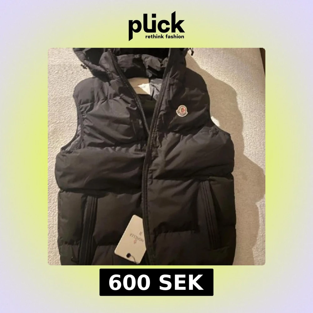 Svart dunväst från Moncler med huva och dragkedja framtill. Västen har två fickor med dragkedja och Moncler-logga på bröstet. Perfekt för lager-på-lager och stilren look.