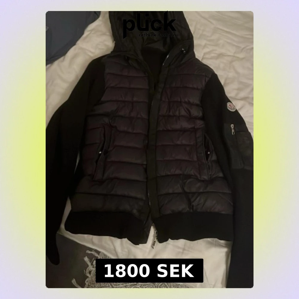 Snygg svart pufferjacka från Moncler med quiltade partier framtill och huva. Jackan har dragkedja, två fickor med knappstängning och Moncler-logga på ärmen. Ärmar och rygg är i stickad kvalitet för extra komfort.
