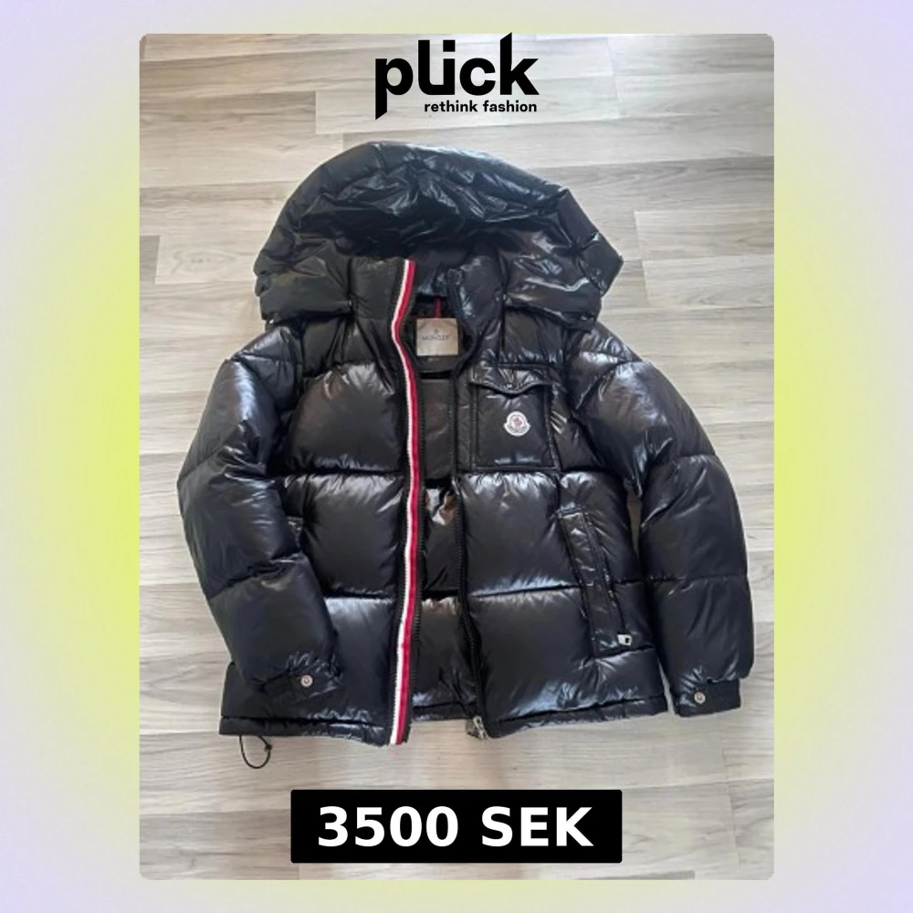 Säljer en svart pufferjacka från Moncler med glansig finish, stor huva och ikonisk Moncler-logga på bröstet. Jackan har dragkedja med rödvit detalj, två sidofickor och innerfoder med serietidningsmönster. Perfekt för kalla dagar och riktigt snygg streetstil.