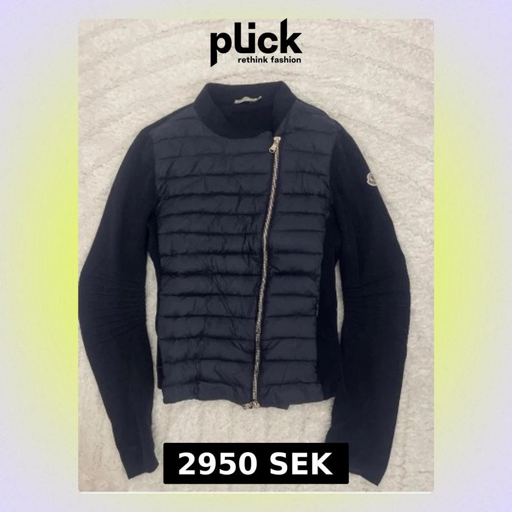 Snygg svart cardigan jacka från Moncler med quiltad framsida och asymmetrisk dragkedja. Ärmarna är stickade och har Moncler-logga på ena armen. Perfekt för lager på lager och en stilren look. Dragkedjan har gått sönder lite