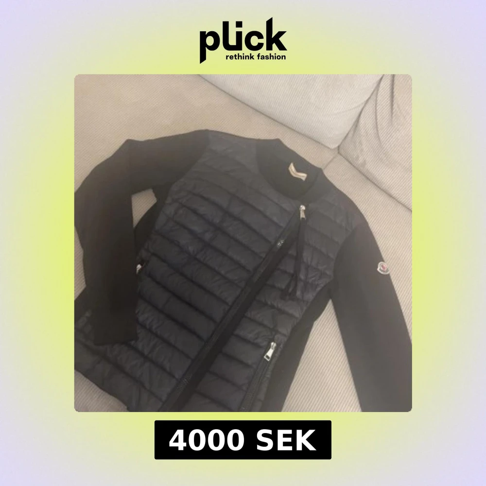 Säljer en svart pufferjacka från Moncler med quiltad front och släta ärmar. Jackan har dragkedja framtill och klassisk Moncler-logga på ärmen. Perfekt för dig som vill ha en stilren och exklusiv look.