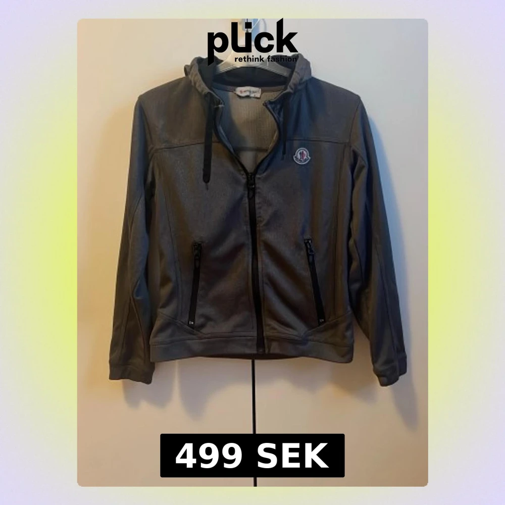 Säljer en grå kofta från Moncler i storlek S. Jackan har huva med snörning, två fickor med dragkedja och klassisk Moncler-logga på bröstet. Perfekt för dig som vill ha en stilren och sportig look.