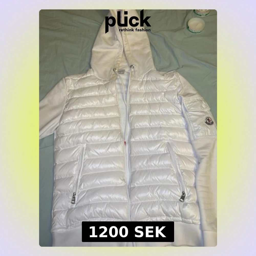 Säljer en clean vit pufferjacka från Moncler med huva och dragkedja framtill. Jackan har quiltad front, mjuka ärmar och två fickor med dragkedja. Klassisk Moncler-logga på ärmen och snörning i huvan för extra stilpoäng.