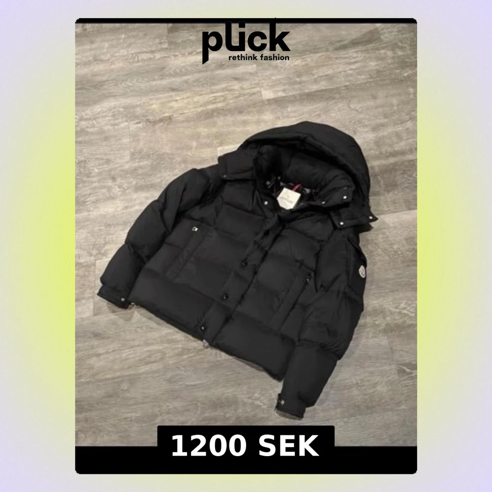 Säljer en svart pufferjacka från Moncler med huva och logotyp på ärmen. Jackan har en quiltad design, dragkedja och knappar framtill samt praktiska fickor. Perfekt för kalla dagar och har en riktigt schysst streetstil.