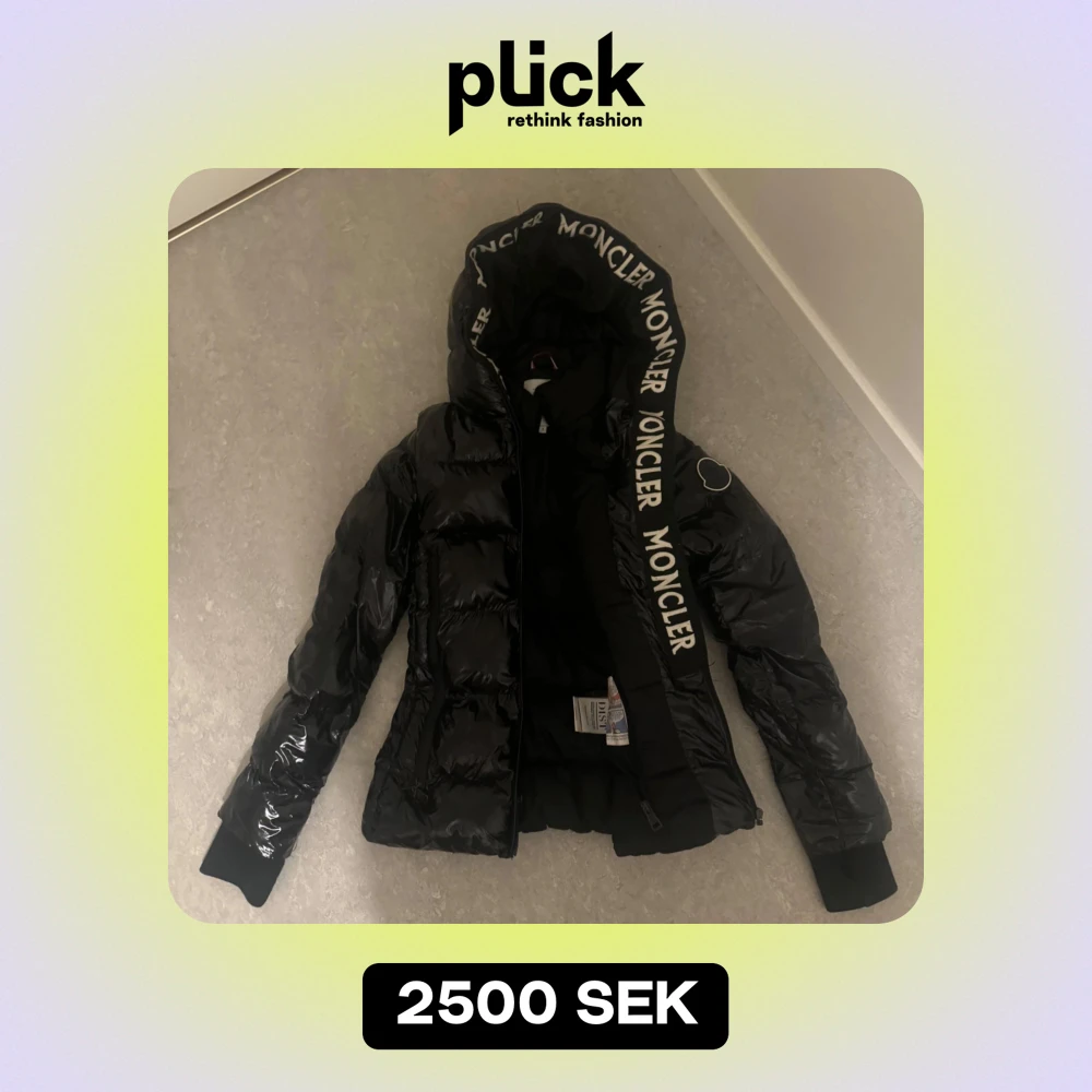 Säljer en snygg svart jacka med stor Moncler logga på huvan. Jackan har en glansig finish och dragkedja framtill. Perfekt för kyliga dagar, säljer pågrund av att den inte kommer till nån användning längre