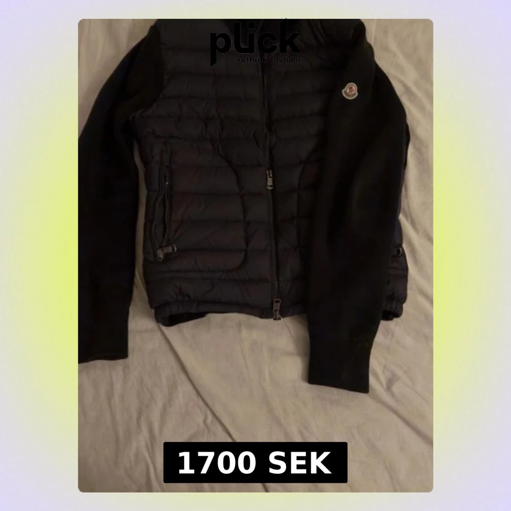 Snygg svart quiltad jacka från Moncler med dragkedja framtill och två sidofickor med dragkedja. Jackan har långärmade stickade ärmar och klassisk Moncler-logga på armen. Perfekt för dig som vill ha en stilren och bekväm jacka. Finns NFS märke i loggan. OBS! Oklart om riktig eller inte!