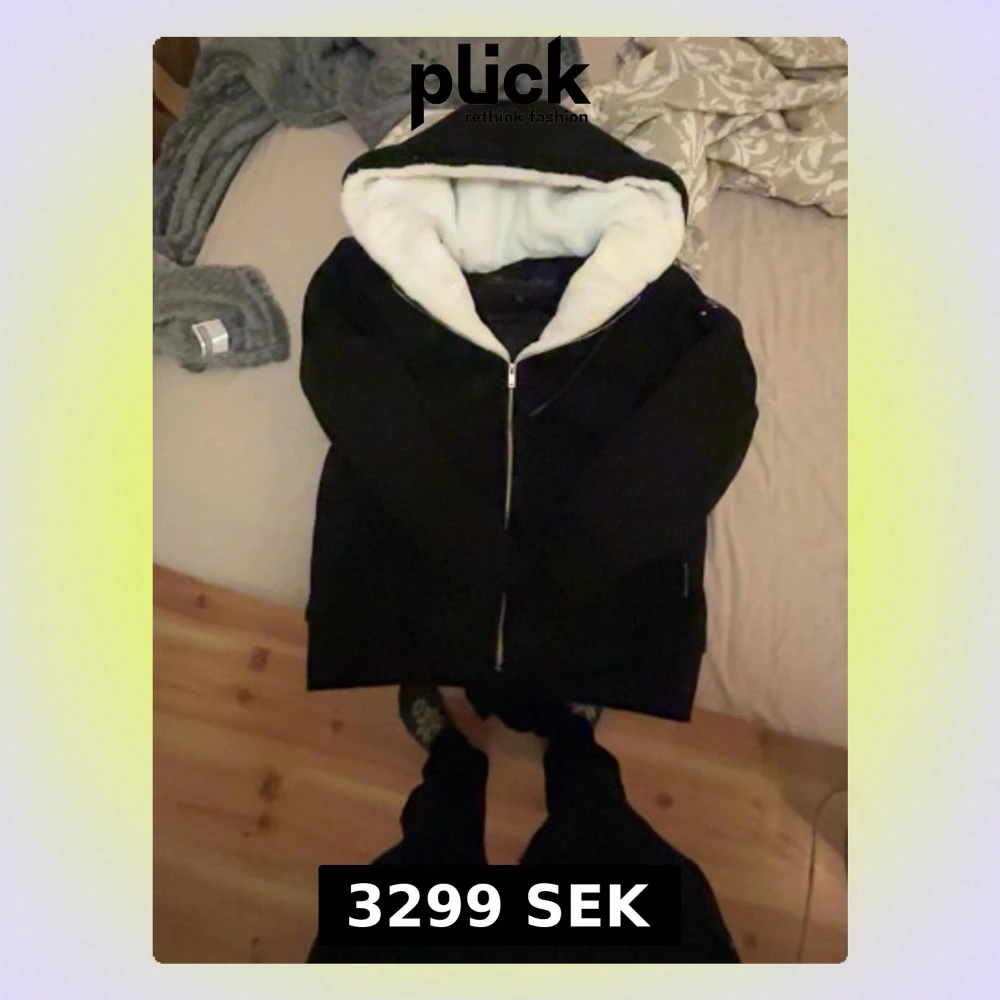 Snygg svart vindjacka med stor huva och vit, fluffig insida. Jackan har dragkedja framtill och en relaxed passform. Perfekt för kyliga dagar när du vill hålla stilen enkel och clean.