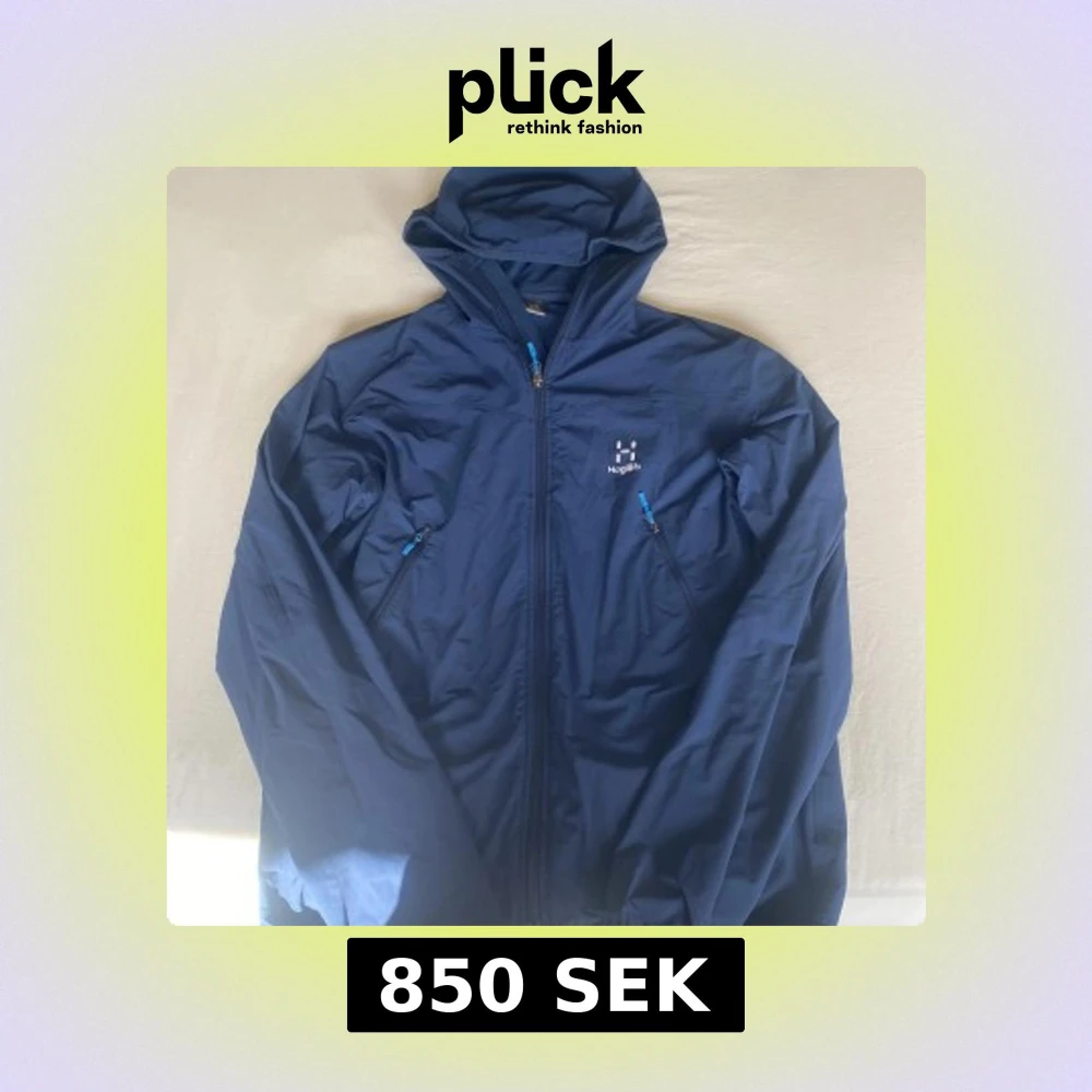 Säljer en blå vindjacka från Haglöfs i storlek L men sitter mer som S eller M. Jackan har huva, två snedställda fickor med dragkedja och hel dragkedja framtill. Perfekt för uteliv och äventyr, lätt och smidig att bära med sig. Klassisk Haglöfs-logga på bröstet.