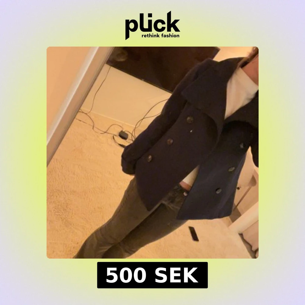 Snygg mörkblå kappa med dubbelknäppning och bred krage. Perfekt till vårens lite kyligare dagar med sin stilrena design. Passar bra till både jeans och mer uppklädda outfits.