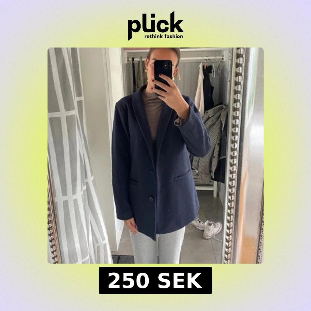 Snygg mörkblå kavajjacka med klassisk krage och två knappar framtill. Jackan har raka fickor och är i en rak, lite loose passform. Storleken är 40 men passar mig som har 36