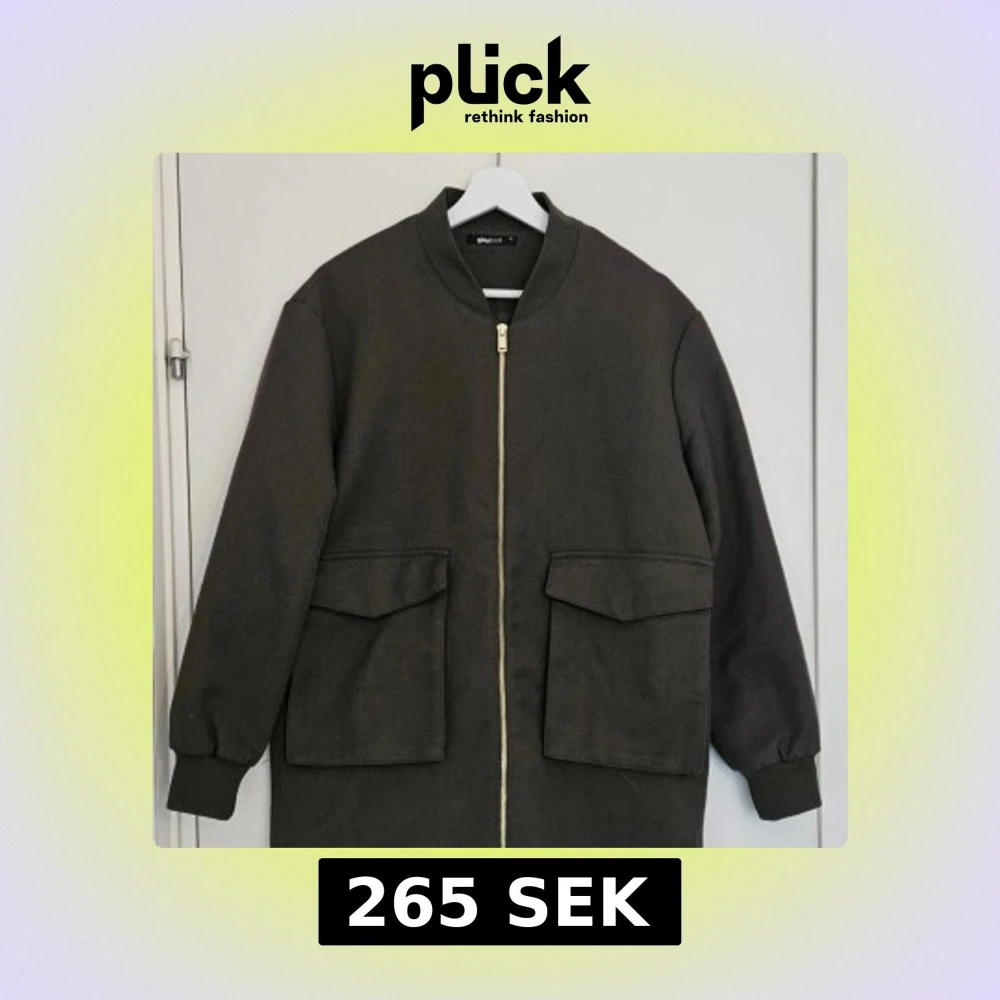 Stilren och minimalistisk jacka från Gina Tricot i mörkgrön färg med guldig dragkedja och stora fickor framtill. Modellen har rak passform med ribbade muddar vid ärmslut och hals. Använd få gånger, Väldigt fint skick. Strl M