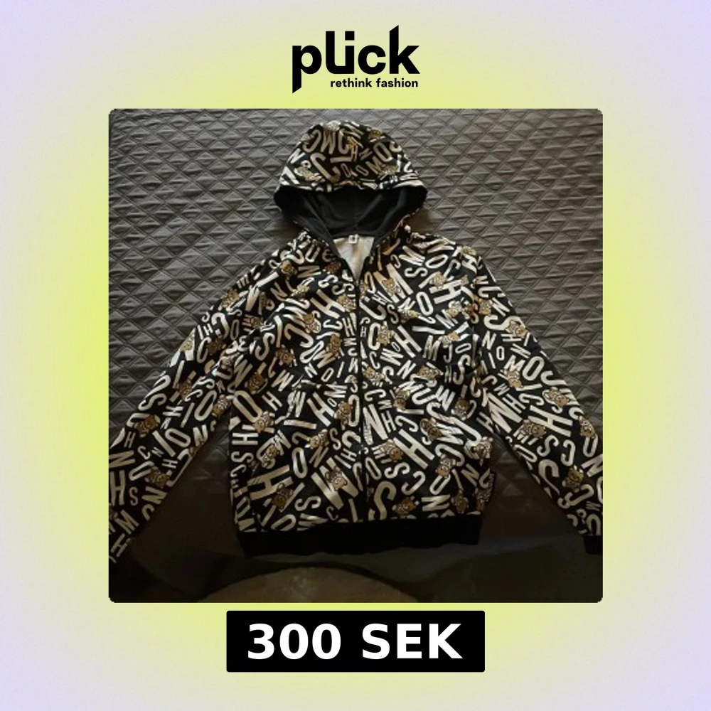 Svart hoodie från Moschino med vit textprint och bruna björnar över hela jackan. Jackan har huva, dragkedja framtill och långa ärmar. Perfekt för dig som gillar streetwear och coola detaljer.
